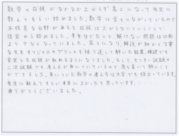 どうも数学ができないということでご入会していただきました。彼の場合、非常にまじめです。ただ、まじめさが災いしてかえって数学があまりできないという状況でした。